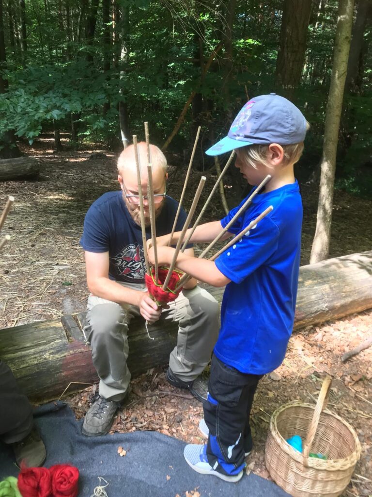 Ein weiteres tolles Erlebnis gab es für unsere Vorschulkinder, denn sie durften erstmals „echte Schulluft“ schnuppern und eine Schulstunde miterleben. Wie spannend! Gemeinsam machten sie sich morgens vom Waldspielplatz aus auf den Weg nach Oppelsbohm zur Schule. Unterwegs konnte man die Vorfreude schon deutlich spüren. In Oppelsbohm angekommen konnten die Kinder die große Pause und anschließend eine Schulstunde miterleben. Hier lernten sie auch schon Lola kennen. Lola ist eine Handpuppe, die mit ihnen die Buchstaben lernen wird. Auch das war ein aufregender Vormittag für die „Füchse“, die sich nun immer mehr auf die Schule freuen. Und was ist wirklich wichtig für den ersten Schultag? Richtig, die Schultüte! Deshalb haben sie diese Woche auch begonnen ihre Schultüten zu „basteln“. Sie werden aus Weidenzweigen geflochten und mit bunter Märchenwolle und Naturmaterialien verziert.
