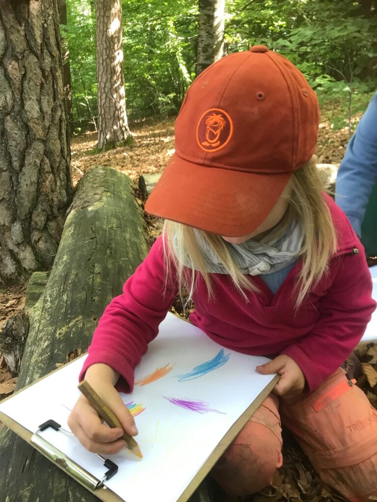 Bei trockenem Wetter machen es sich die Waldkinder auch gerne mit Buntstiften, Wasserfarben und einem Klemmbrett gemütlich und lassen ihrer Kreativität auf dem Papier freien Lauf.