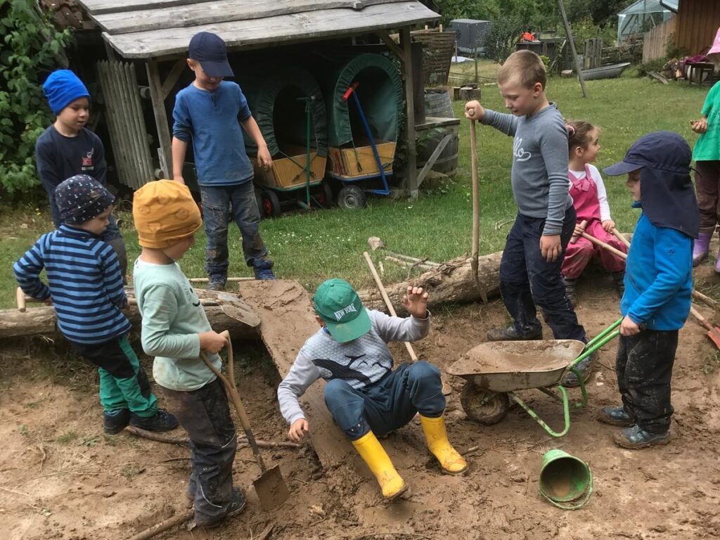 Im Freispiel haben die Kinder diese Woche begeistert gelehmt. Hier sind tolle Dinge wie zum Beispiel Würfel und Mikrophone entstanden. Die nasse Erde hat auch in der Matschgrube zu kreativem Spiel eingeladen. Hier haben die Kinder aus einem Brett, Matsch und Wasser eine rasante Rutsche gebaut und natürlich gleich ausprobiert. Das hat Spaß gemacht!