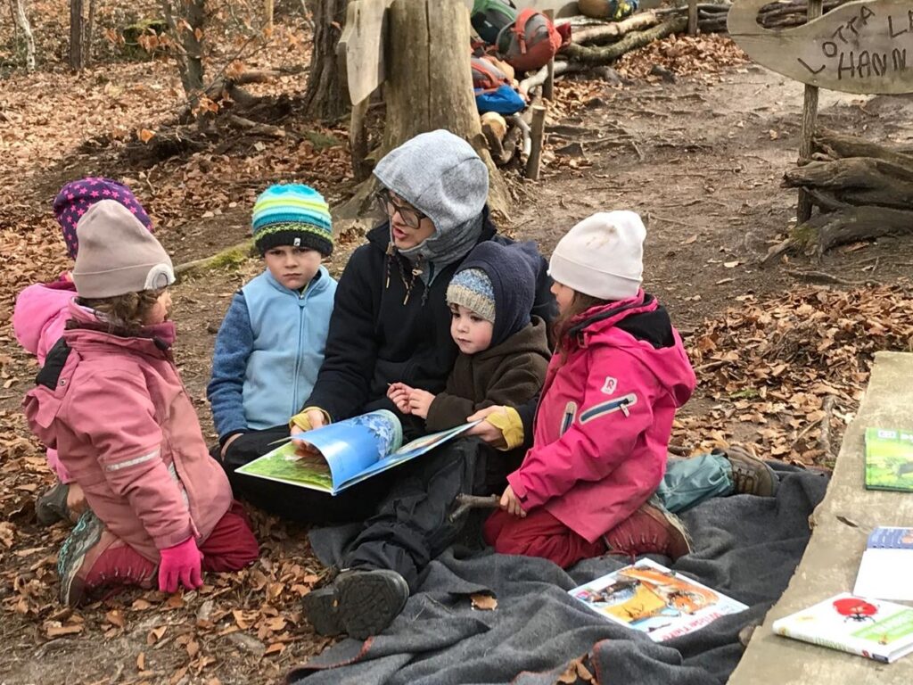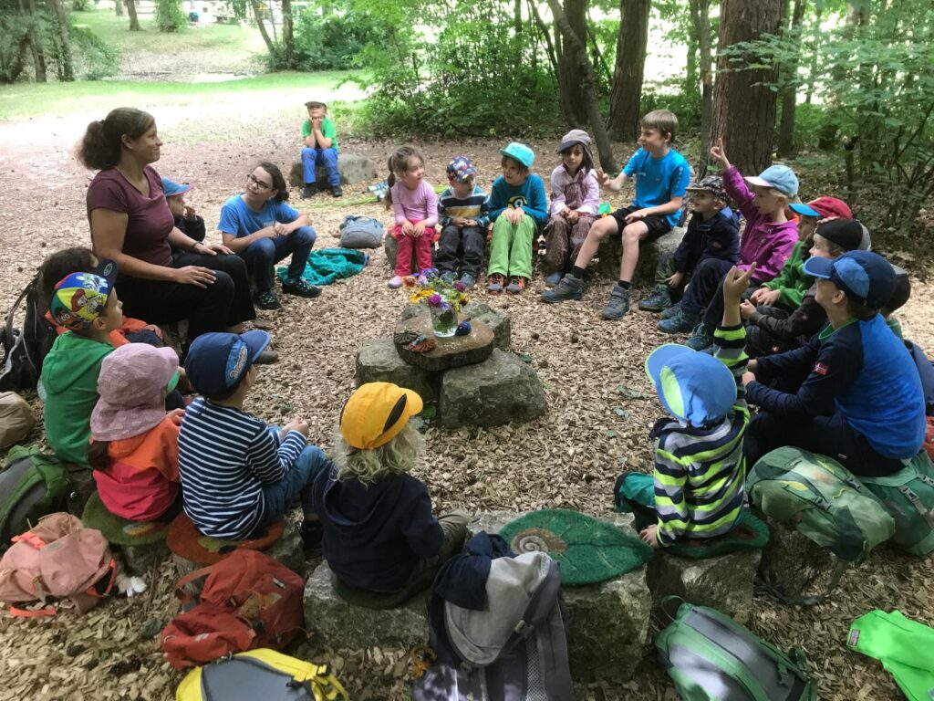 Unsere erste Zeremonie ist immer der Morgenkreis. Er eröffnet den Tag im Wald. Wir begrüßen alle Kinder, es wird gespielt, gesungen und erzählt, oder die Kinder zum Sprechen, Fühlen und Zuhören angeregt. Meist gibt es ein bestimmtes Thema, mit dem sich die Kindergartengruppe eine Zeit lang beschäftigt und dazu Experimente macht oder Geschichten hört. Besondere Anlässe, Feste oder Geburtstage werden angesprochen und der geplante Tagesablauf mit den Kindern geklärt. Dann geht es aber los!