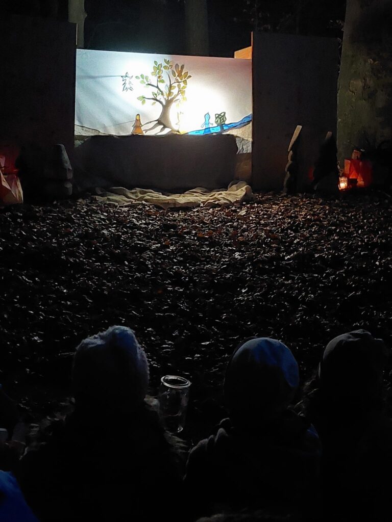 Angekommen an der „Dicken Berta“ durften die Kinder und ihre Eltern und Geschwister ein zauberhaftes Schattentheater erleben. Die liebevoll gespielte Geschichte handelte von den vier Elementen, die sich stritten, wer denn am wichtigsten war und die dann erkannten, dass sie nur gemeinsam etwas erreichen konnten und alle wichtig und besonders sind.