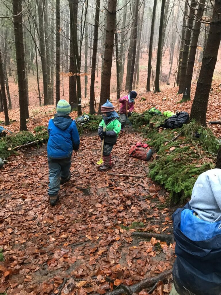 Die Waldsofas wurden begrünt und der Vorspielplatz, an dem im Advent jeden Tag eine Geschichte vorgespielt wird, mit einer großen Wurzel und Reisig bestückt und vorbereitet. Die Kinder waren bei den Vorbereitungen ganz eifrig mit dabei und halfen alle – ob klein oder groß – fleißig und voller Vorfreude auf die kommende Adventszeit mit.