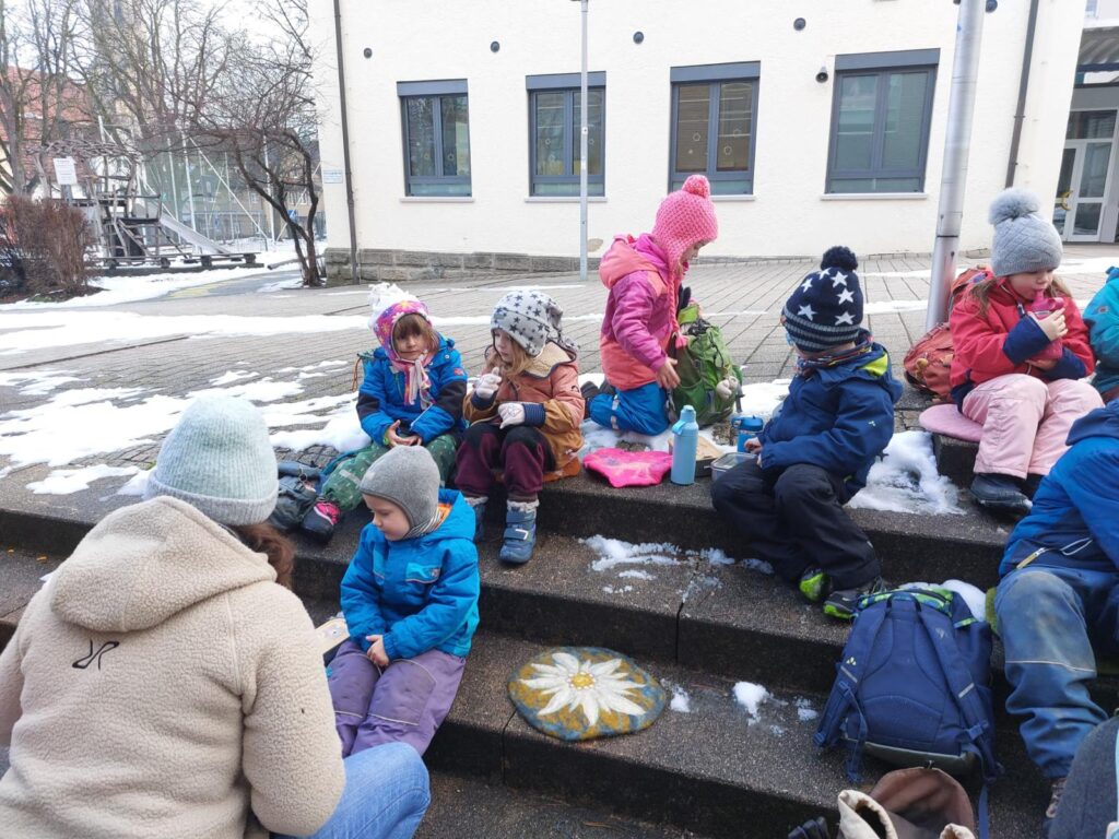 Am Mittwoch durften die Waldkinder einen tollen Ausflug ins Phönix-Figurentheater nach Schorndorf unternehmen. Freudig aufgeregt zogen sie vom Spielplatz in Hößlinswart los und fuhren mit dem Bus nach Schorndorf. Angekommen gab es vor dem Theater erst einmal eine Vesperpause zur Stärkung.