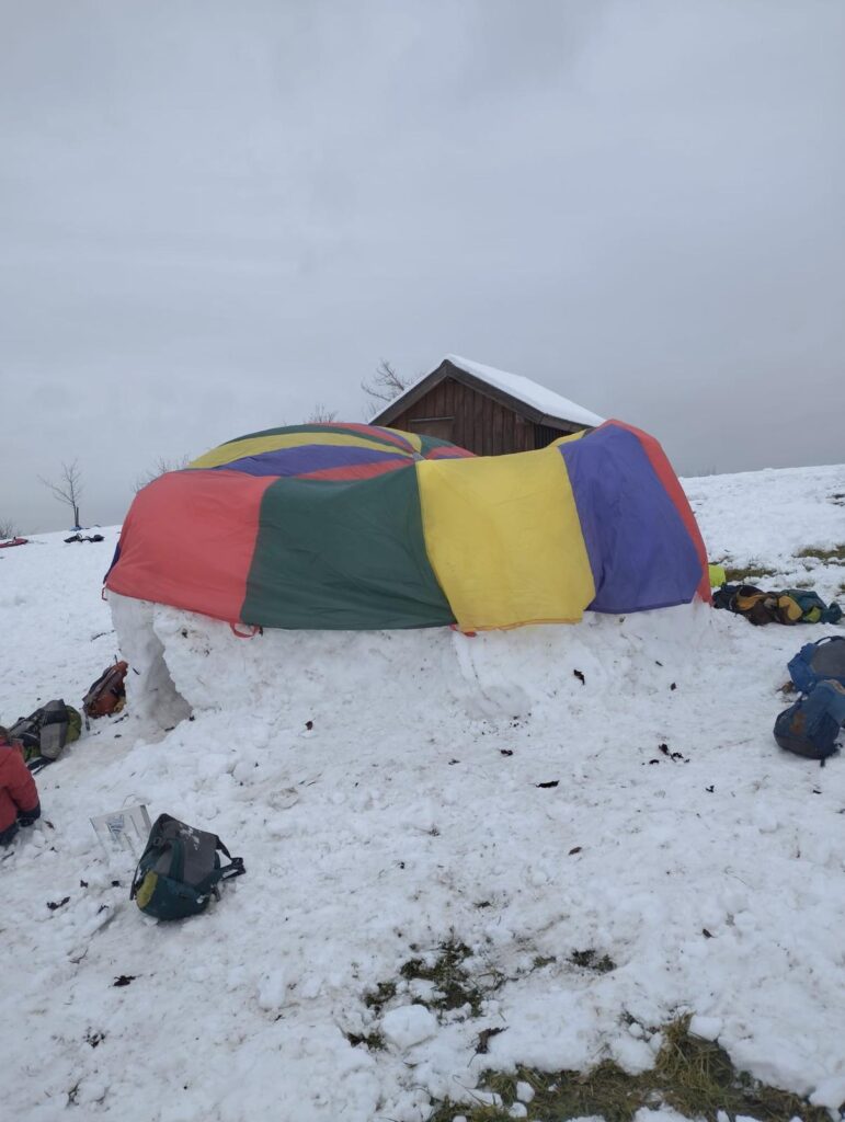 Außerdem baute die Kindergartengruppe mit dem vielen Schnee eine große Schneeburg, auf die dann noch als Dach ein Schwungtuch gelegt wurde, sodass eine richtige Schneehöhle entstand.