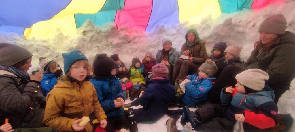 Diese war so groß, dass alle Kinder zusammen hinein passten und sogar darin vespern konnten. Was für ein tolles Erlebnis. Durch die vielen Kinder, die zusammen gerückt sind, wurde es sogar angenehm warm darin – ein wirklich ganz besonderes Winter-Waldkindergartenvesper.