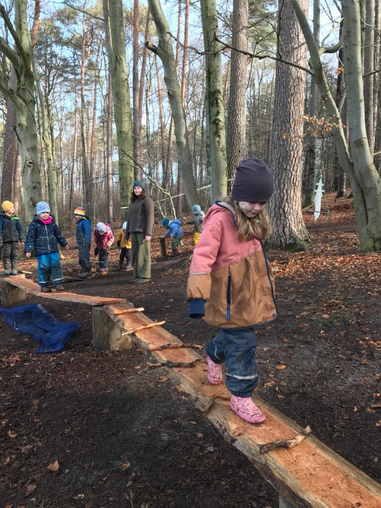 Von hier aus ging es weiter zu einem „reißenden Fluss“. Die Kinder balancierten über Holzscheiben und wackelige Brücken um diesen zu überqueren.