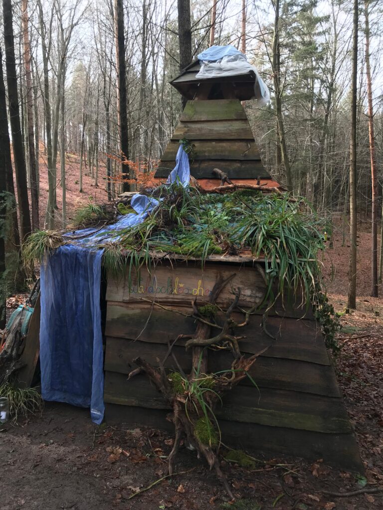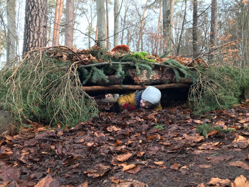 Weiter ging’s zu einem Parcours. Hier durften die Kinder zuerst durch einen „Feuerreifen“ steigen, einem mit rot angemaltem Stroh umwickeltem Ring. Danach krabbelten sie durch eine „Maulwurfs-Erdhöhle“. Das war ganz schön eng und die Kinder mussten sich um dies zu schaffen flach auf den Boden legen und unter einem Wald-Hindernis hindurch krabbeln.