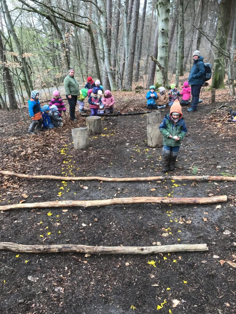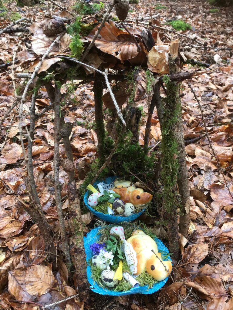Die Osterfeier im Sinne der Wurzelkinder startete mit einer Fantasiereise im Morgenkreis. Anschließend machten sich viele kleine Wurzelkinder auf den Weg durchs Wurzelreich: An einem Tau zogen sie sich am Kletterhang nach oben. Welche Blume waren sie? Jedes Kind durfte sich die ausgesuchte Blume auf die Wange schminken lassen. Weiter ging es durch den Wald und einen Geheimweg, bis sie schließlich am Stückle des Kindergartens ankamen. Inzwischen waren alle hungrig und freuten sich auf das Festtagsbuffet, das hier auf sie wartete. Belegte Brote, Obst, Gemüse, gefärbte Eier und leckeres Gebäck! Frisch gestärkt machten sie sich im Anschluss auf den Weg zur „dicken Berta“. An diesem Waldplatz wartete die nächste Station auf sie: Ein Parcours zum Eierlauf. Gar nicht so einfach, aber es hat viel Spaß gemacht und es ist kein Ei zu Bruch gegangen!