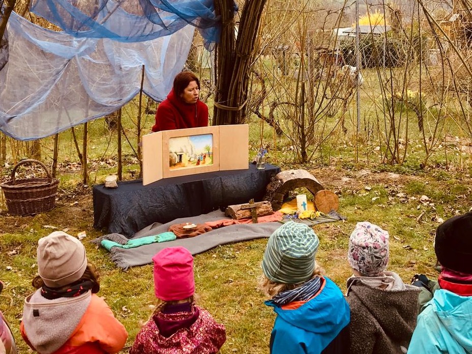 Die Kinder freuten sich auf die gemeinsame Feier und hörten zur Vorbereitung die Ostergeschichte, die durch passende Bilder im Erzähltheater begleitet wurde.